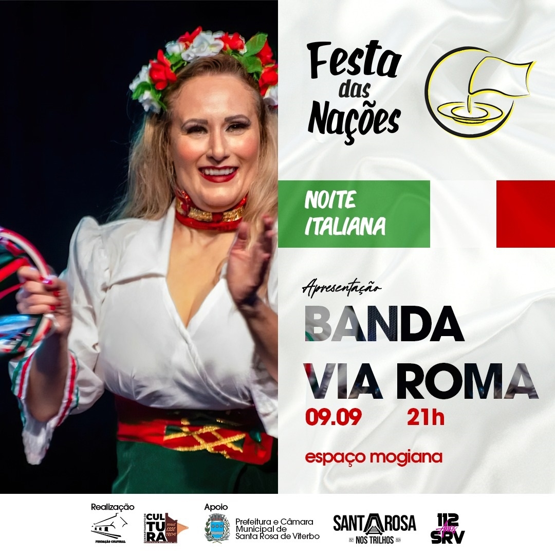 A Prefeitura Municipal, através do Departamento de Cultura e a Fundação Cultural, com apoio da Câmara Municipal, traz a Banda Via Roma para animar a noite italiana na 1ª Festa das Nações nesta sexta-feira, 09, em Santa Rosa de Viterbo. Composta por grandes músicos e com um lindo ballet temático, a banda apresenta canções maravilhosas que são conhecidas e cantadas por todo público.
