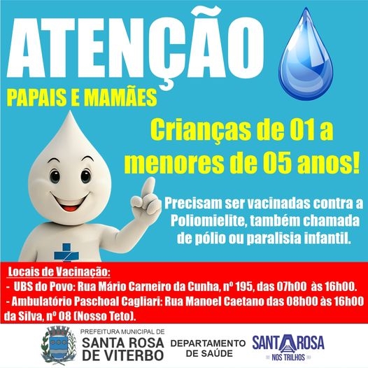 A Campanha de Vacinação contra a Pólio foi prorrogada até o dia 30 de setembro. Até o momento, a cobertura vacinal em Santa Rosa de Viterbo ainda é considerada muito baixa, sendo de 41,2% segundo informou o Departamento Municipal de Saúde.
