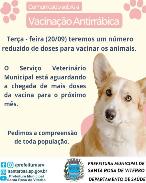 Estamos realizando a estratégia de VACINAÇÃO ANTIRRÁBICA ANIMAL DE ROTINA 2022, na qual deverão ser vacinados todos os cães e gatos do município, a partir de 90 dias de vida. Devido a grande procura da população pela vacinação, estamos com poucas doses disponíveis nesse mês de Setembro.