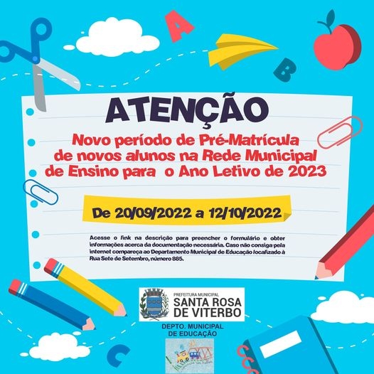 O Departamento Municipal de Educação da Prefeitura de Santa Rosa de Viterbo disponibiliza, através do link abaixo, o Formulário de Pré-Matrícula para o ano letivo de 2023 com o objetivo de que os pais ou responsáveis por alunos em idade escolar de Creche, Pré-Escola e Ensino Fundamental (Anos iniciais), que se encontram fora da Rede Municipal de Ensino (alunos que nunca estudaram ou que estejam na rede particular e desejam se matricular na rede municipal, realizem sua inscrição on-line.