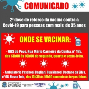 O Departamento Municipal de Saúde  comunica que a partir de amanhã, terça-feira, 20, estará liberada a segunda dose de reforço da vacina contra a Covid-19 para pessoas com mais de 35 anos, lembrando que é preciso respeitar o intervalo de 04 meses após a última dose.