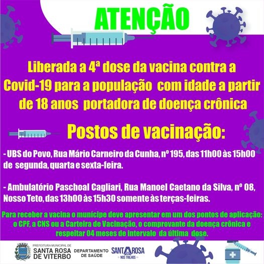 Liberada a 4ª dose da vacina contra a Covid-19 para a população com idade a partir de 18 anos portadora de doença crônica.