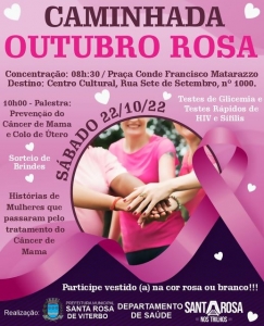 O Departamento de Saúde da Prefeitura Municipal realizará, neste sábado, 22, uma Caminhada simbólica referente ao Outubro Rosa, movimento de conscientização e de detecção precoce do Câncer de Mama.