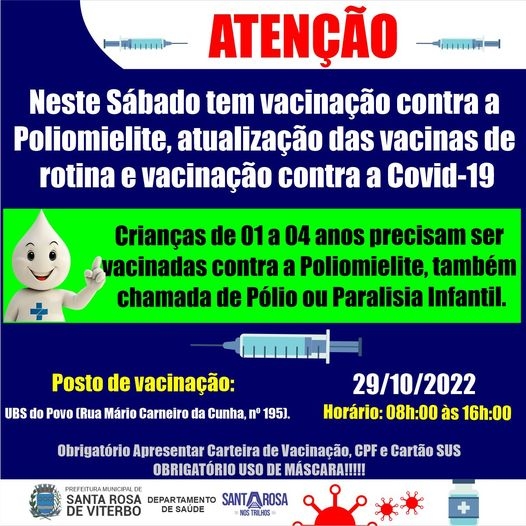 O Departamento de Saúde informa que neste sábado, 29 de outubro, será realizada a Campanha de Vacinação contra a Poliomielite para crianças de 01 a 04 anos, atualização da carteira de vacinação para crianças e adolescentes que estão em atraso nas vacinas de rotina, e também vacinação contra a Covid-19, lembrando que estamos aplicando a quarta dose para pessoas a partir de 18 anos com intervalo de quatro meses da última dose.
