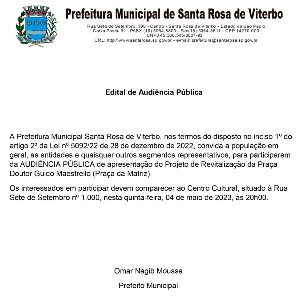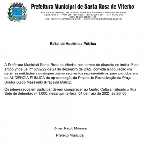 Convite para AUDIÊNCIA PÚBLICA de apresentação do Projeto de Revitalização da Praça Doutor Guido Maestrello (Praça da Matriz).
