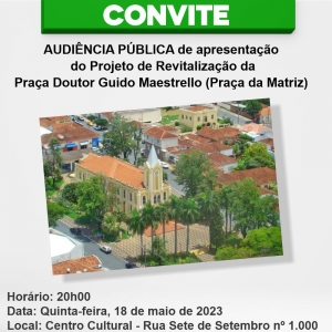 A população em geral, as entidades e quaisquer outros segmentos representativos, estão convidados a participarem da AUDIÊNCIA PÚBLICA de apresentação do Projeto de Revitalização da Praça Doutor Guido Maestrello (Praça da Matriz), marcada para amanhã, 18 de maio de 2023, às 20h00, no Centro Cultural, situado à Rua Sete de Setembro nº 1.000.