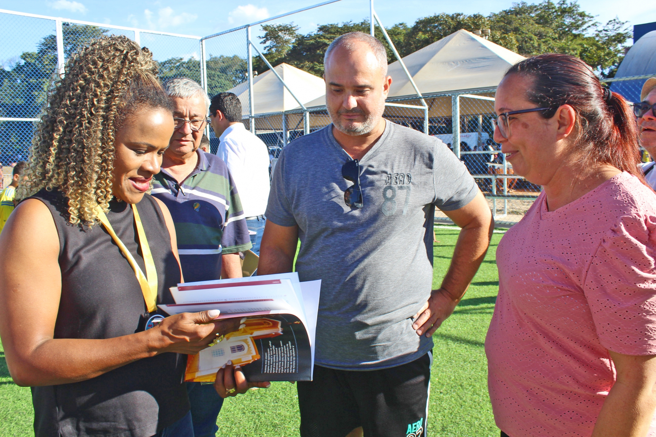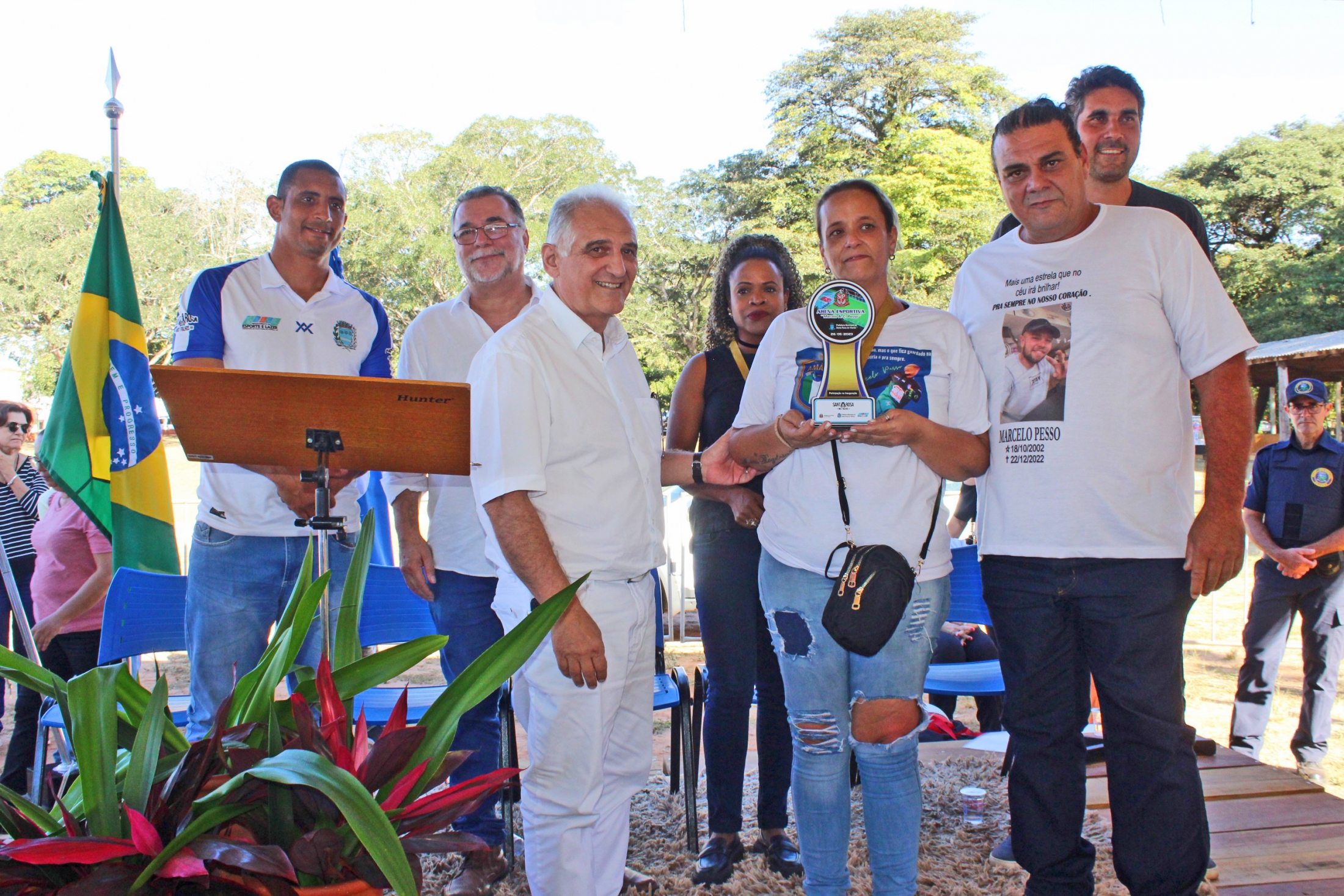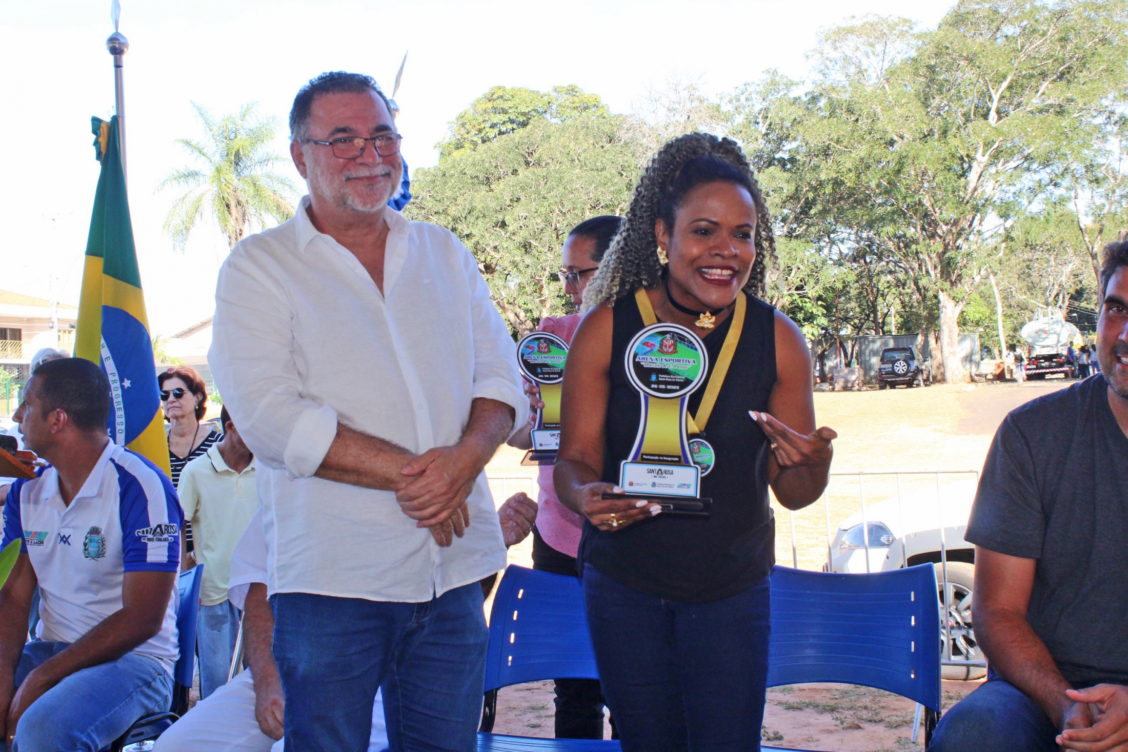A Secretária Helena e os Pais de Marcelo receberam troféus, assim como os alunos de escolas de Futebol e Basquete, que receberam medalhas simbólicas da inauguração da Arena. A assessora Andrea Rose também presenteou a coronel com um livro da história da cidade de Santa Rosa de Viterbo e um DVD da Banda Sinfônica santa-rosense.