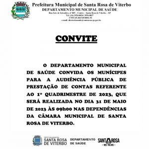 O DEPARTAMENTO MUNICIPAL DE SAÚDE CONVIDA OS MUNÍCIPES PARA A AUDIÊNCIA PÚBLICA DE PRESTAÇÃO DE CONTAS REFERENTE AO 1º QUADRIMESTRE DE 2023, QUE SERÁ REALIZADA NO DIA 31 DE MAIO DE 2023, ÀS 09h00, NAS DEPENDÊNCIAS DA CÂMARA MUNICIPAL DE SANTA ROSA DE VITERBO.