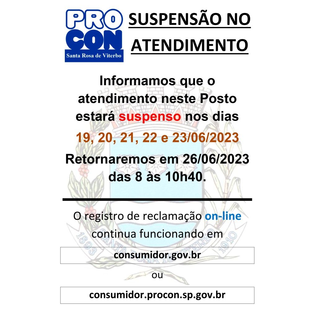 O PROCON informa que o atendimento estará suspenso nos dias 19, 20, 21, 22 e 23/06/2023. O retorno das atividades ocorrerá na segunda-feira, dia 26 de junho, das 08h00 às 10h40.