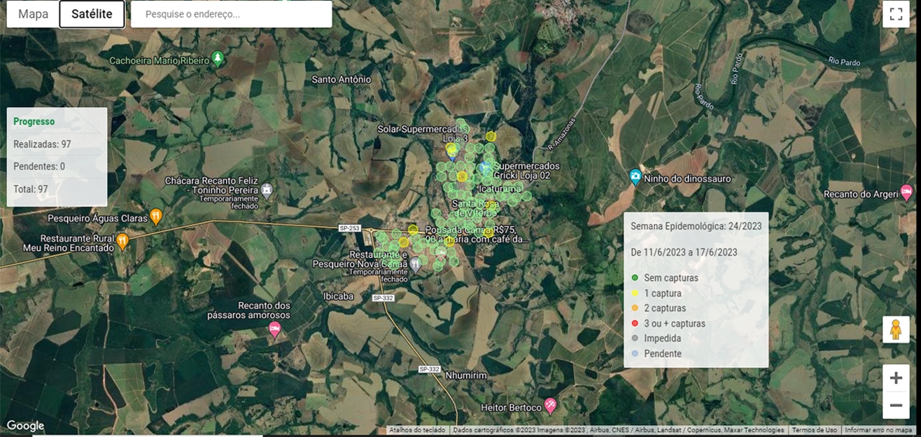 O mapa, que ilustra este release, é exemplo de uma atualização diária gerada a partir da quantidade de fêmeas coletadas durante as vistorias realizadas pelos Agentes de Combate às Endemias. Os pontos verdes sinalizam os locais que não possuíam Aedes aegypti, enquanto que os pontos amarelos significam que ocorreram uma captura. Já os pontos laranjas indicam que houve duas capturas e os pontos vermelhos mostram que foram encontrados três ou mais fêmeas.