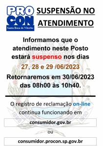 O PROCON informa que o atendimento estará suspenso nos dias 27, 28 e 29/06/2023. O retorno das atividades ocorrerá na sexta-feira, dia 30 de junho, das 08h00 às 10h40.