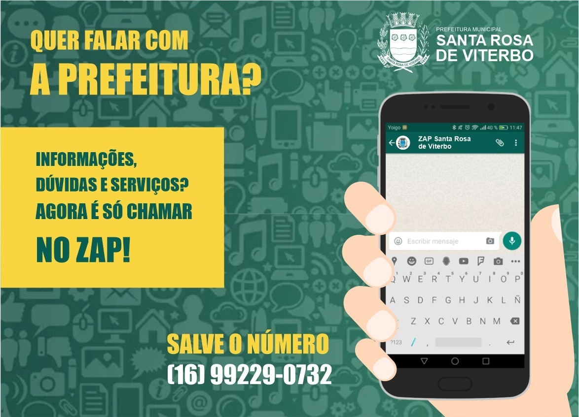 A partir de hoje a Prefeitura Municipal de Santa Rosa de Viterbo passa a oferecer mais um canal de comunicação para os munícipes, que poderão obter informações, fazer solicitações, sugestões, reclamações e esclarecer dúvidas relacionadas aos serviços públicos através do aplicativo WhatsApp.