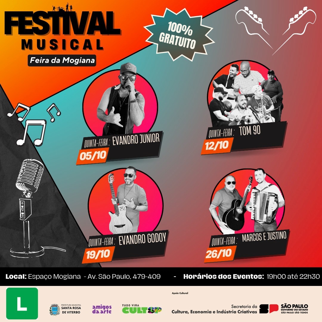 Com apoio institucional da Secretaria da Cultura, Economia e Indústria Criativas do Governo do Estado de São Paulo, em parceria com a Prefeitura Municipal de Santa Rosa de Viterbo e execução da Associação Paulista dos Amigos da Arte (APAA), o Departamento de Cultura informa a programação especial de shows para a Feira da Mogiana durante o mês de outubro. Serão quatro atrações de estilos musicais variados com artistas contratados através do projeto Atendimento Técnico ao Município - CHAMADA PÚBLICA 02/2023 - PROGRAMAS DE DIFUSÃO DA AMIGOS DA ARTE.