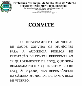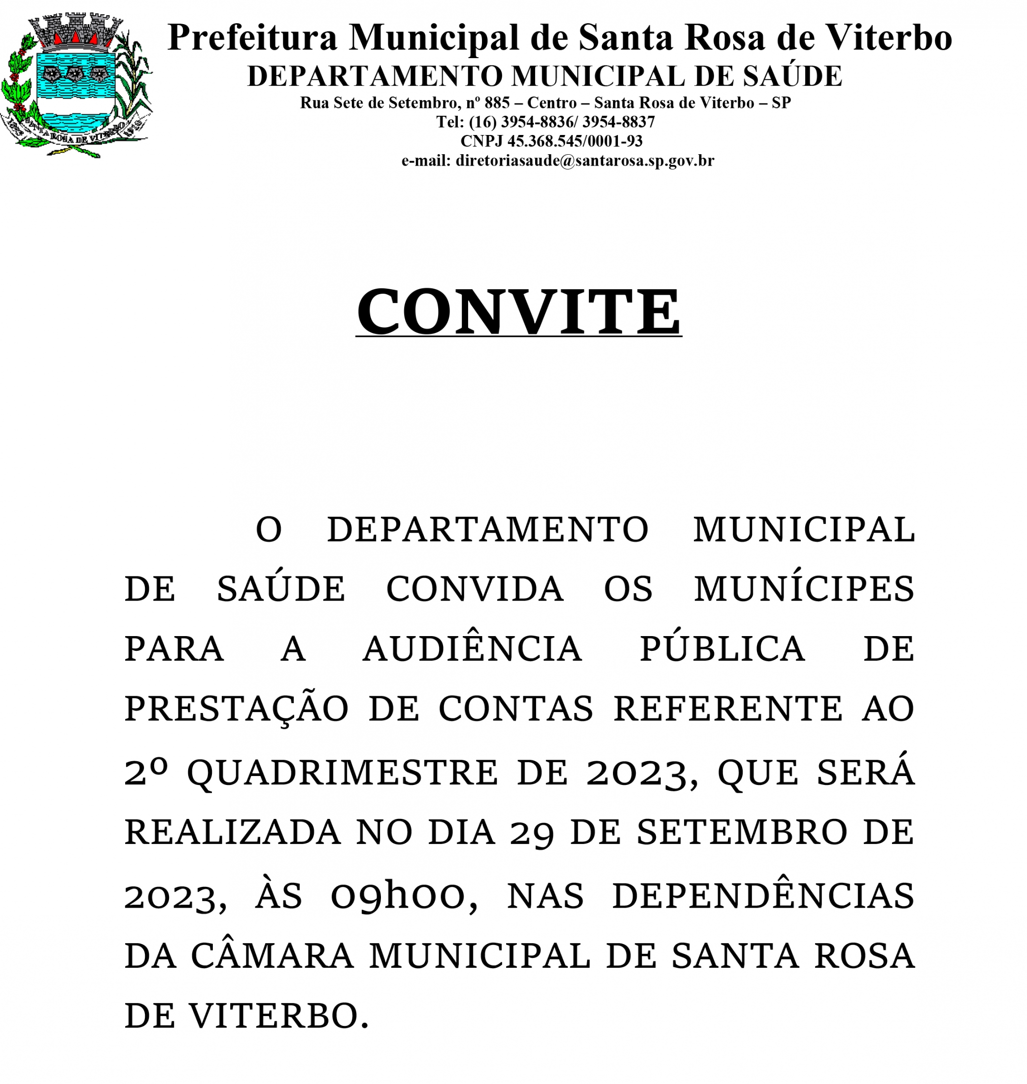 O Departamento Municipal de Saúde convida os munícipes para a Audiência Pública de Prestação de Contas referente ao 2º quadrimestre de 2023, que será realizada no dia 29 de setembro de 2023, às 09h00, nas dependências da Câmara Municipal de Santa Rosa de Viterbo.