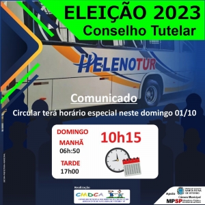 Eleitores que necessitarem do transporte público para exercerem a cidadania neste domingo de Eleição do Conselho Tutelar, o circular fará uma rota excepcional no horário das 10h15, com saída do Nosso Teto.