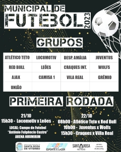 Com 13 equipes divididas em quatro grupos começa, neste sábado, 21/10, o tão esperado CAMPEONATO MUNICIPAL DE FUTEBOL 2023. A competição, que promete grandes jogos, conta com alguns detalhes importantes, como a estreia das equipes GRÊMIO SRV e CRAQUES DO INTERIOR, que trarão para o certame jovens promessas do futebol local, mesclados com alguns jogadores experientes.