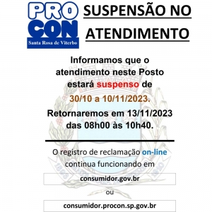 O PROCON informa que o atendimento presencial estará suspenso de 30/10 a 10/11/2023. O retorno das atividades ocorrerá no dia 13 de novembro, das 08h00 às 10h40.
