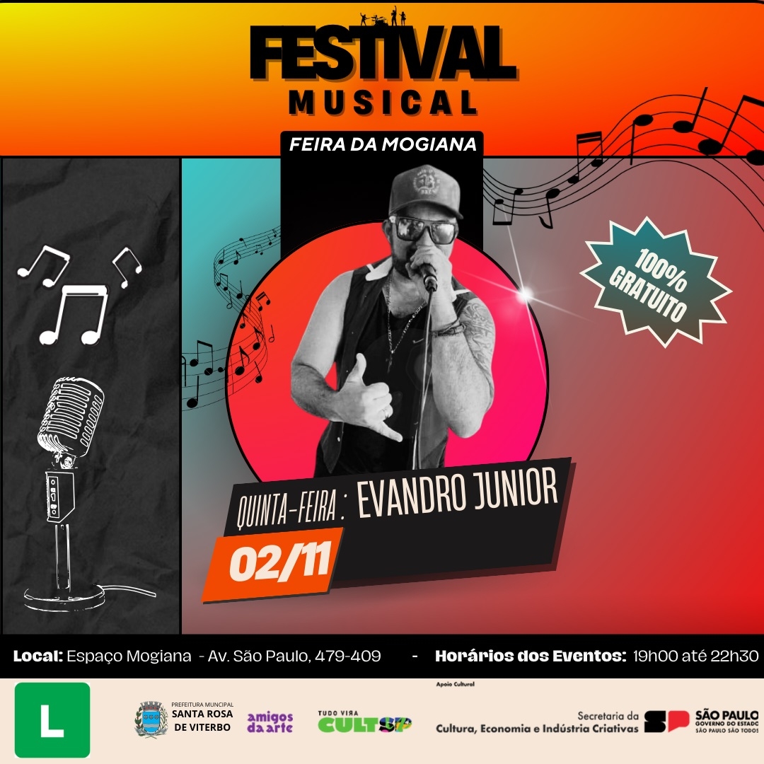 Remarcado por conta do mau tempo, o show do cantor, compositor, apresentador e locutor santa-rosense, Evandro Junior, acontece nesta quinta-feira, 02 de novembro. Com seu inseparável violão, o músico apresenta um repertório que vai do modão ao moderno, interpretando canções clássicas, que marcaram época e todo o público gosta. É show para dançar, cantar, curtir sozinho, acompanhado ou com a galera. Só não vale ficar parado.