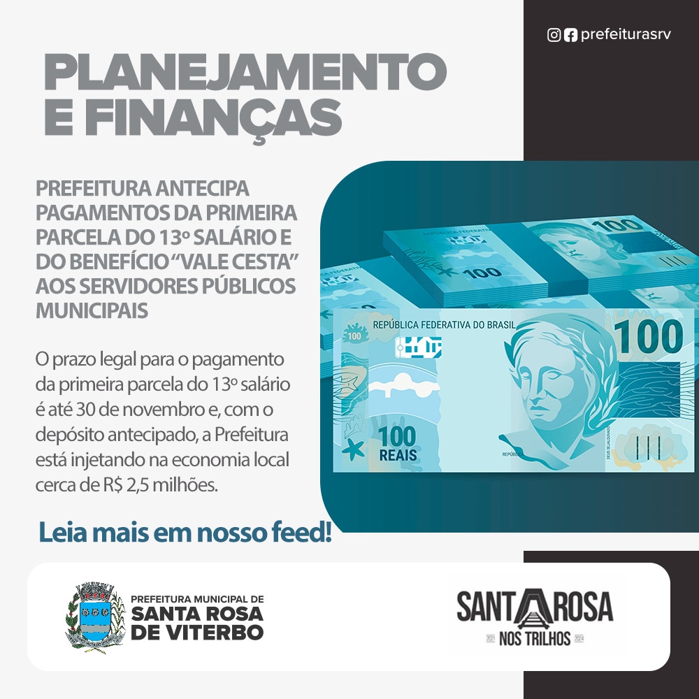Além do pagamento referente ao mês de outubro, a Prefeitura Municipal de Santa Rosa de Viterbo antecipou, para hoje, o pagamento da primeira parcela do 13º salário aos servidores públicos municipais que não solicitaram a sua antecipação do benefício ao longo do ano. Vale ressaltar que o prazo legal para o pagamento da primeira parcela do 13º salário é até 30 de novembro de 2023 e, com isso, a Prefeitura está injetando na economia local cerca de R$ 2,5 milhões de reais.