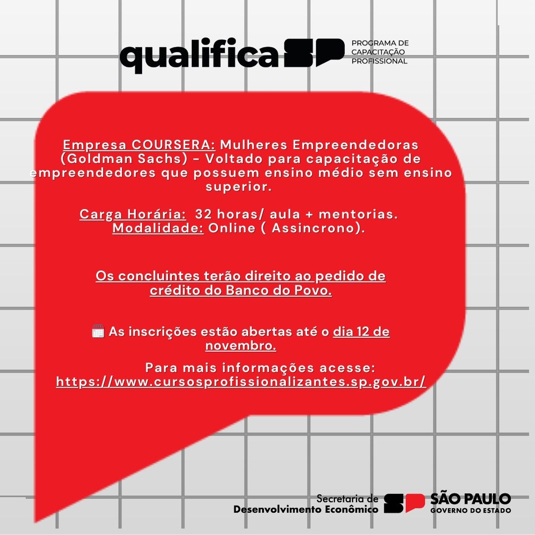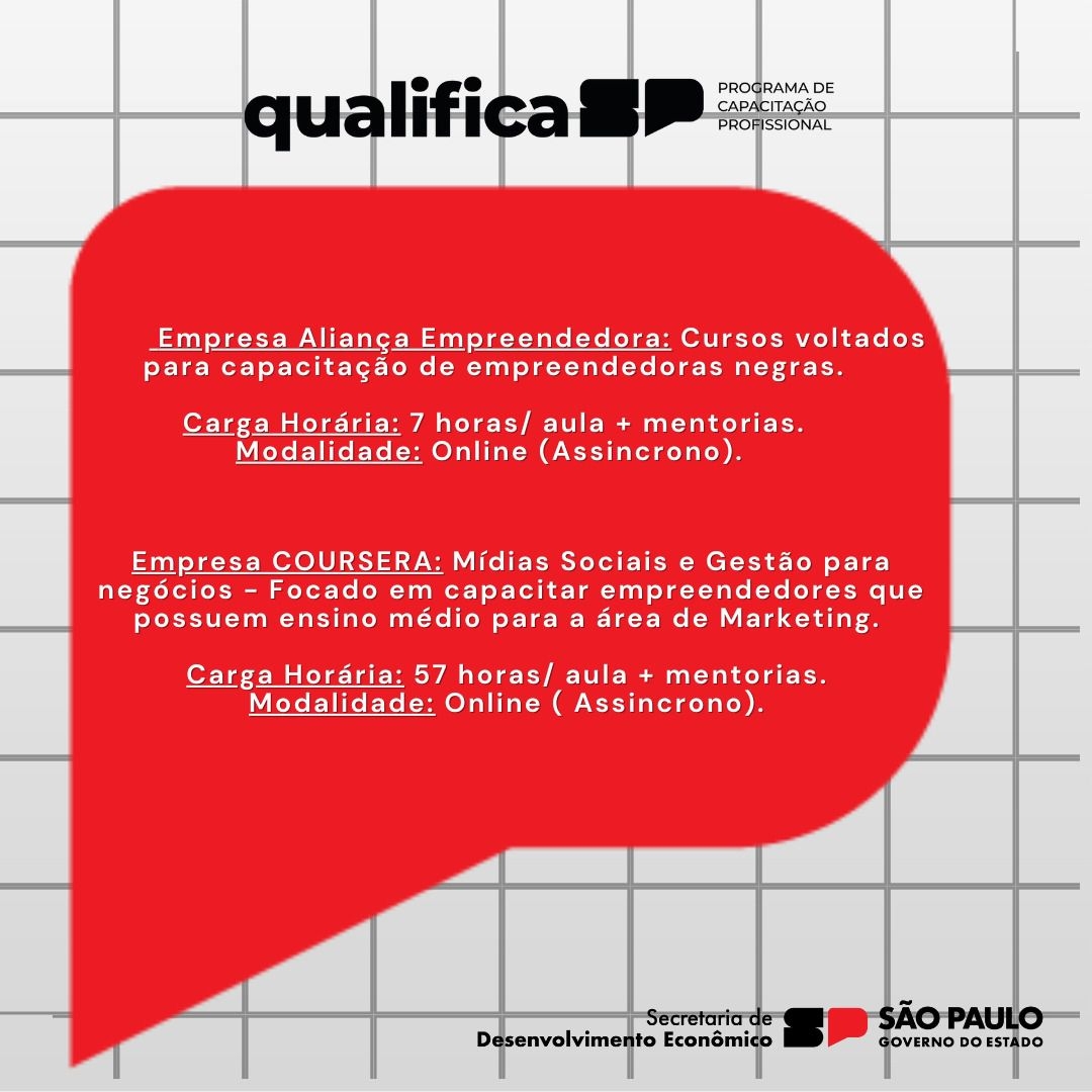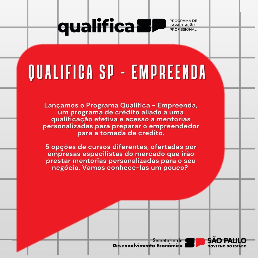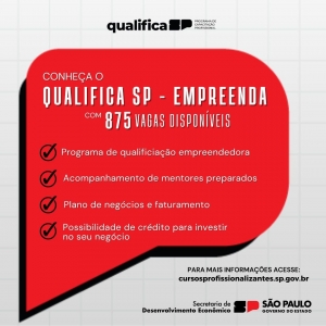 A Secretaria de Desenvolvimento Econômico do Estado de São Paulo abriu inscrições no programa Qualifica Empreenda SP com 875 vagas para cursos gratuitos de gestão, empreendedorismo e mídias sociais para empreendedores (formais e informais). Para participar é preciso ter mais de 18 anos e o próprio negócio em execução há pelo menos entre tres e seis meses. As oportunidades estão disponíveis nos formatos presencial e on-line.