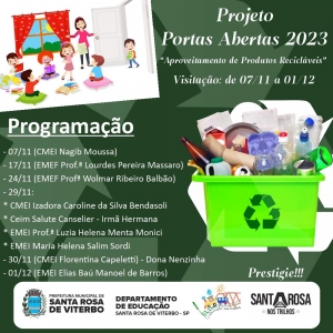 O Setor de Programas Educacionais, do Departamento Municipal de Educação, criou o Projeto “Portas Abertas”, um evento onde são aprimoradas as relações interpessoais entre escola e comunidade. O objetivo é apresentar às famílias dos educandos e a comunidade local todo trabalho realizado pelos profissionais de educação com os alunos, trazendo os familiares para participarem ativamente da rotina escolar. “Também é uma forma de enaltecer as produções realizadas das crianças e elevar a autoestima delas, além de unir forças com as famílias, valorizar saberes locais e encadear ações para o desenvolvimento das crianças, visando diminuir a evasão escolar e a redução do índice de abandono” comenta Ana Monici, Chefe do Setor de Programas Educacionais.