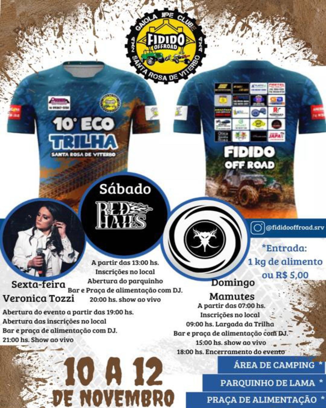 O evento, que é realizado através de parceria entre o clube Fidido OffRoad e o Departamento de Cultura, Turismo, Esportes e Lazer da Prefeitura Municipal de Santa Rosa de Viterbo, também contará com shows ao vivo e Dj. Veronica Tozzi (hoje), Red Halls (amanhã), e Mamutes (domingo), sobem ao palco para animar, descontrair e proporcionar alegria aos participantes e visitantes.