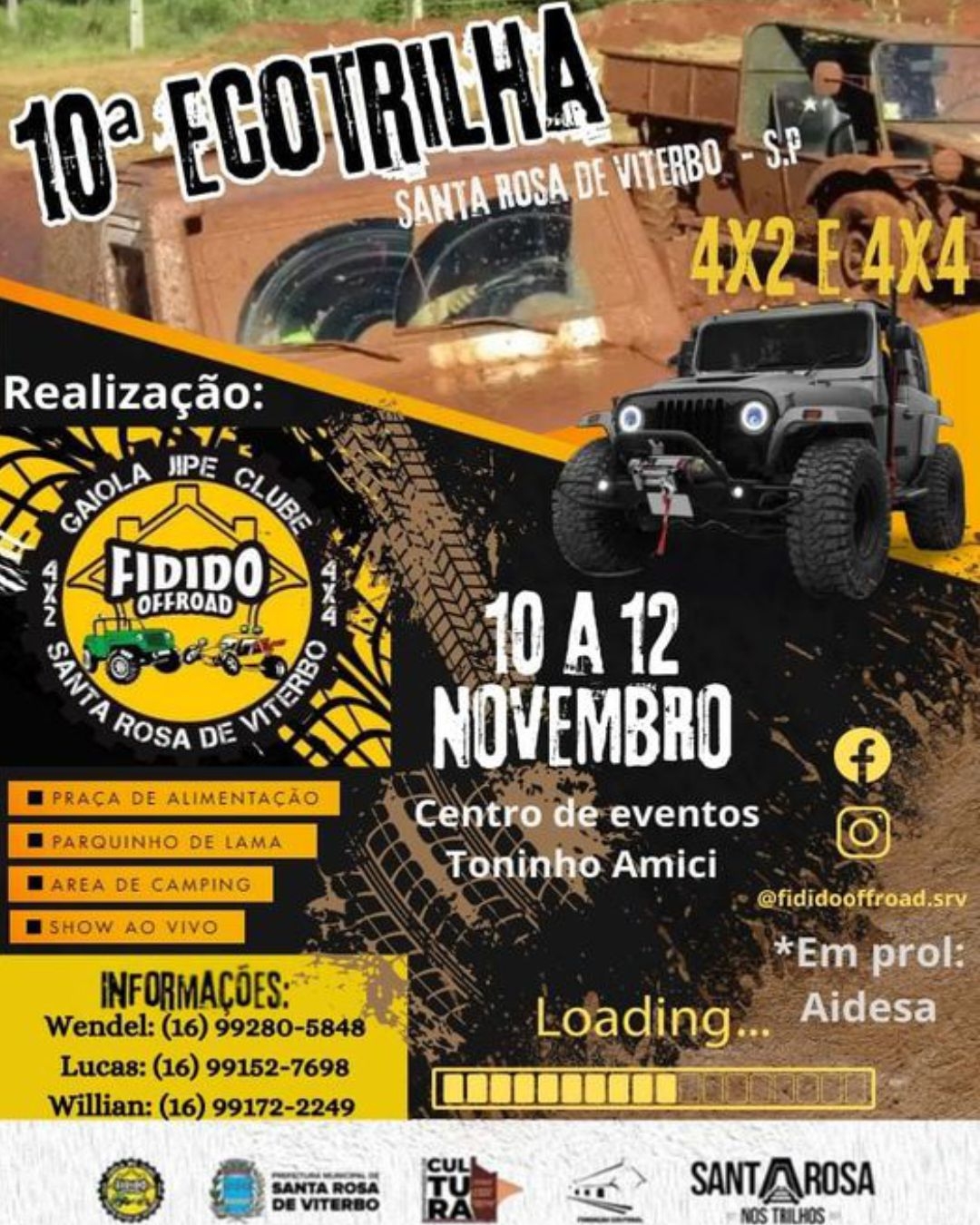 A 10ª Ecotrilha começa logo mais e vai até domingo, 12 de novembro, no Recinto Toninho Amici. Como de costume a organização preparou uma superestrutura para agradar e atender todos os públicos com praça de alimentação, serviço de bar, parquinho de lama e área de camping desafiadora, de muita lama e obstáculos com descidas, subidas e curvas que vão testar a habilidade dos pilotos de jipes, gaiolas e motos, além de proporcionar aventura e diversão para quem curte aventura sobre rodas.