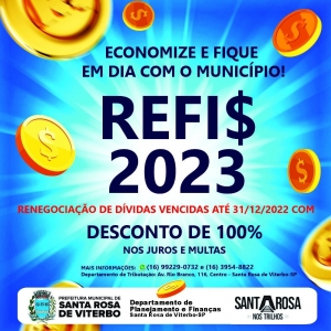 Os contribuintes que possuem débitos tributários e não tributários até 31 de dezembro de 2022 podem aderir ao Programa de Refinanciamento de Dívida – REFIS, até amanhã, sexta-feira, 08 de dezembro de 2023. A Prefeitura de Santa Rosa de Viterbo está ofercendo redução de 100% (cem por cento) do valor das multas e juros moratórios.