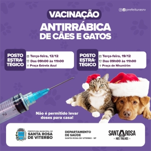 O Serviço Veterinário Municipal informa locais e datas dos próximos Postos Estratégicos de vacinação Antirrábica em cães e gatos.