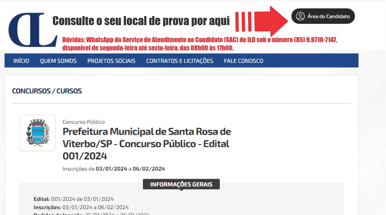 O local de prova está disponível desde segunda-feira na área do candidato no site da empresa organizadora do Concurso ou pelo link: https://www.ildesenvolvimento.com.br/login/?redir=%2Fpainel%2F, onde deve-se fazer o login com CPF e senha. O candidato que não conseguir acessar o local de prova deverá entrar em contato pelo WhatsApp do Serviço de Atendimento ao Candidato (SAC) do ILD sob o número (85) 9.9710-7147, disponível de segunda-feira até sexta-feira, das 08h00 às 17h00, exceto feriados.