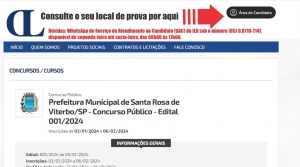 Acontecem neste domingo, 25 de fevereiro de 2024, as provas Objetiva e Dissertativa do Concurso Público da Prefeitura de Santa Rosa de Viterbo. Os candidatos devem comparecer ao local designado com 60 (sessenta) minutos de antecedência, munido do documento de identificação com foto informado no ato da inscrição e caneta esferográfica (tinta preta ou azul), fabricada em material transparente.