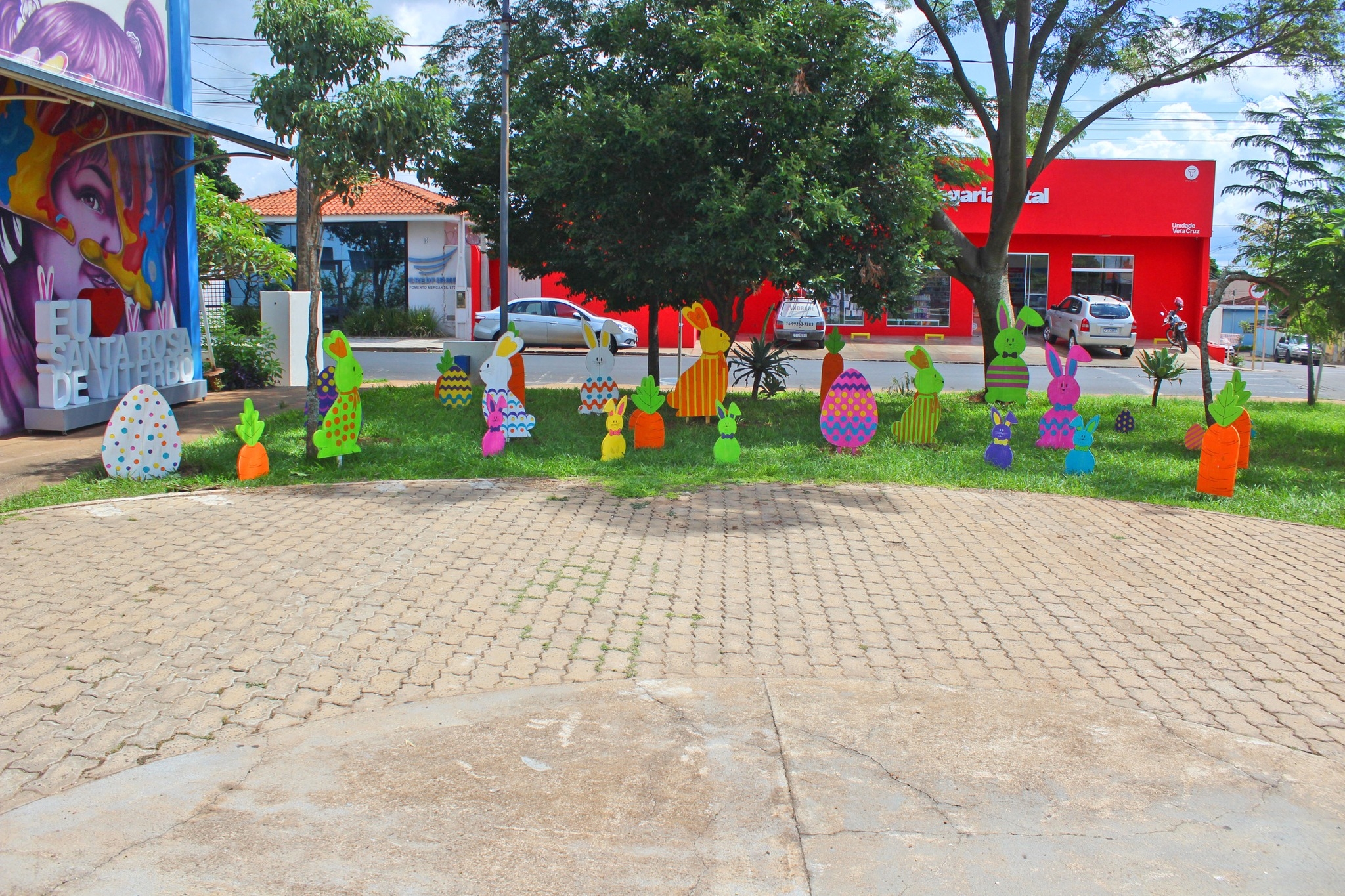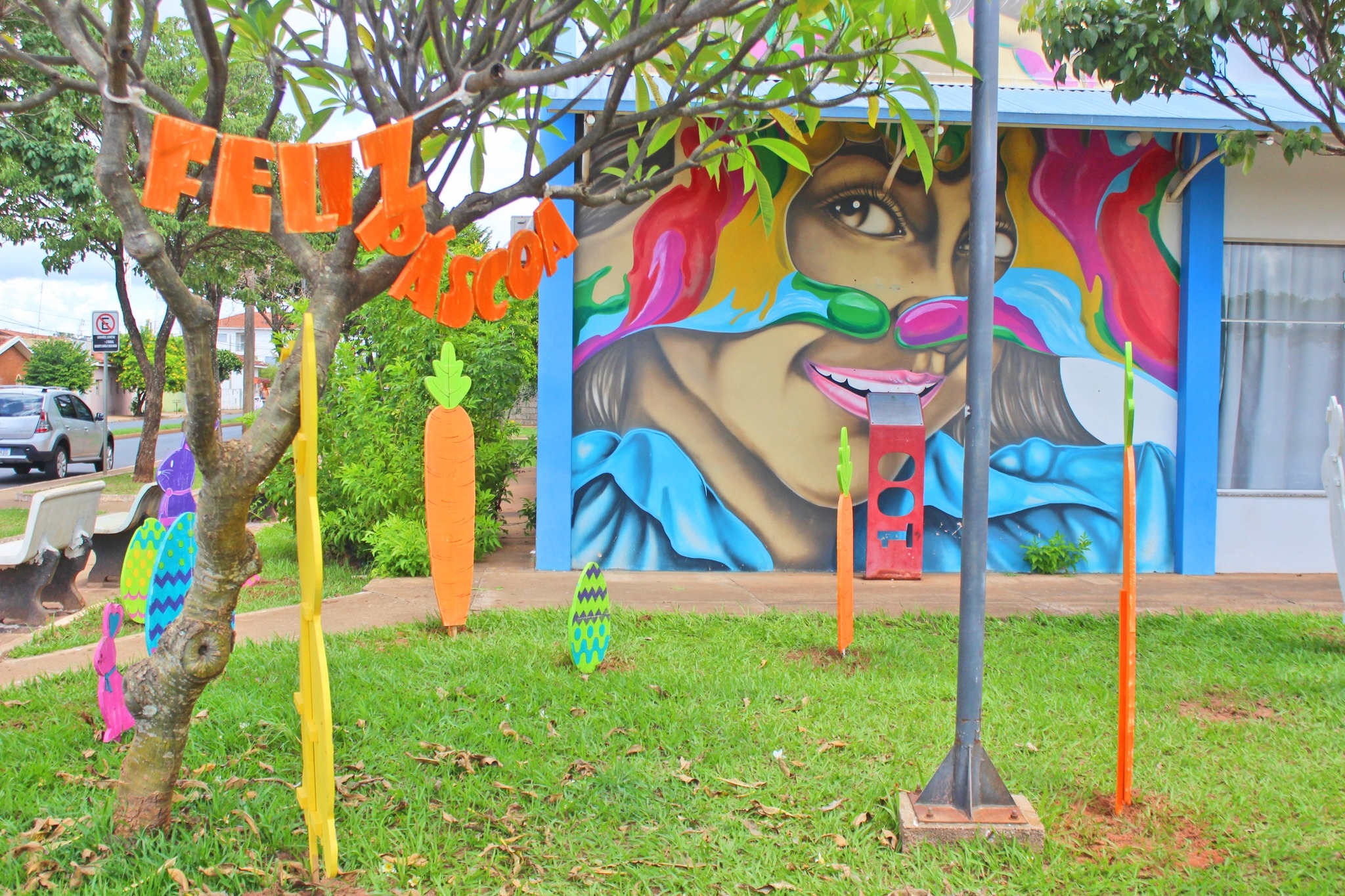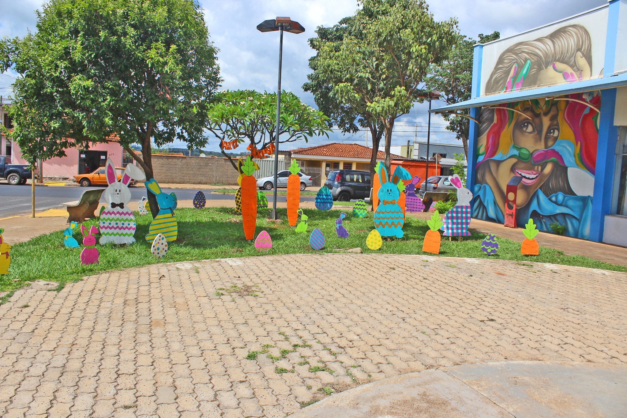 Localizado em frente ao Centro Cultural, o Jardim foi cuidadosamente decorado com ovos coloridos, cenouras e coelhos adoráveis, criando um ambiente mágico, acolhedor e cheio de simbolismos.
