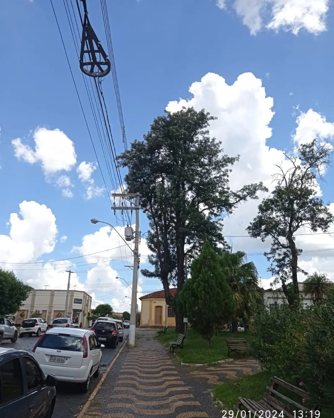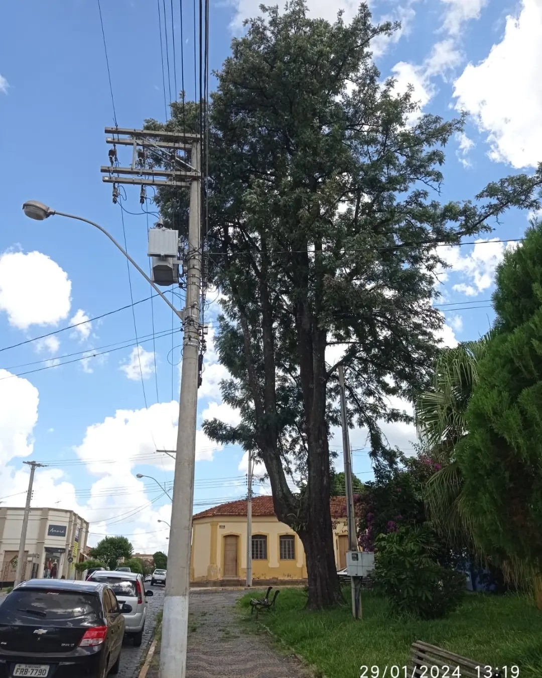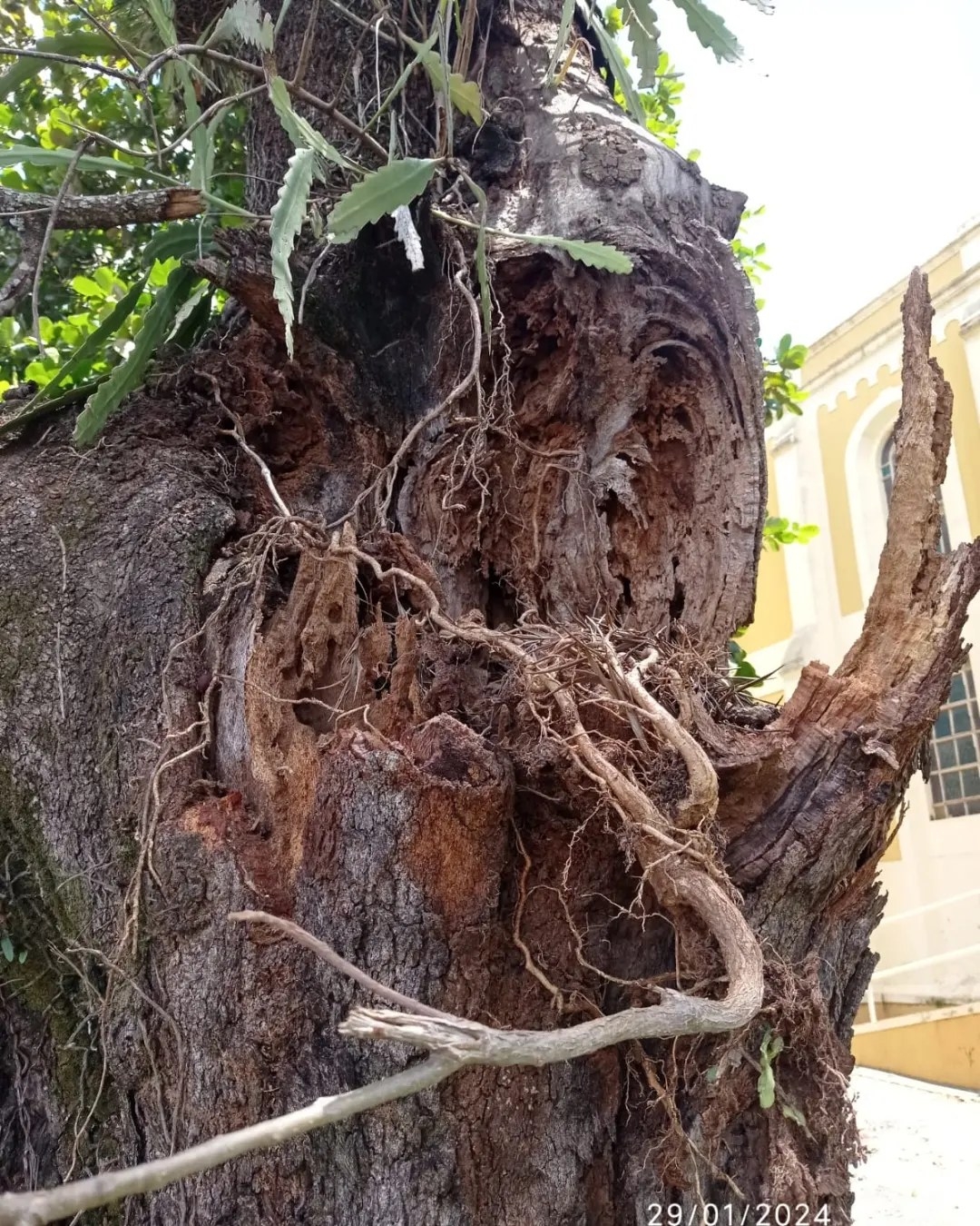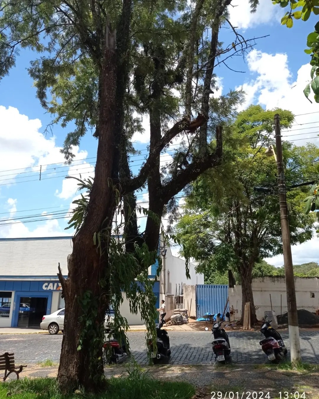 Além de estarem danificadas com broca no meio do caule e na raiz, as Grevíleas serão substituídas por risco de queda sobre a Igreja e sobre a fiação de alta tensão.