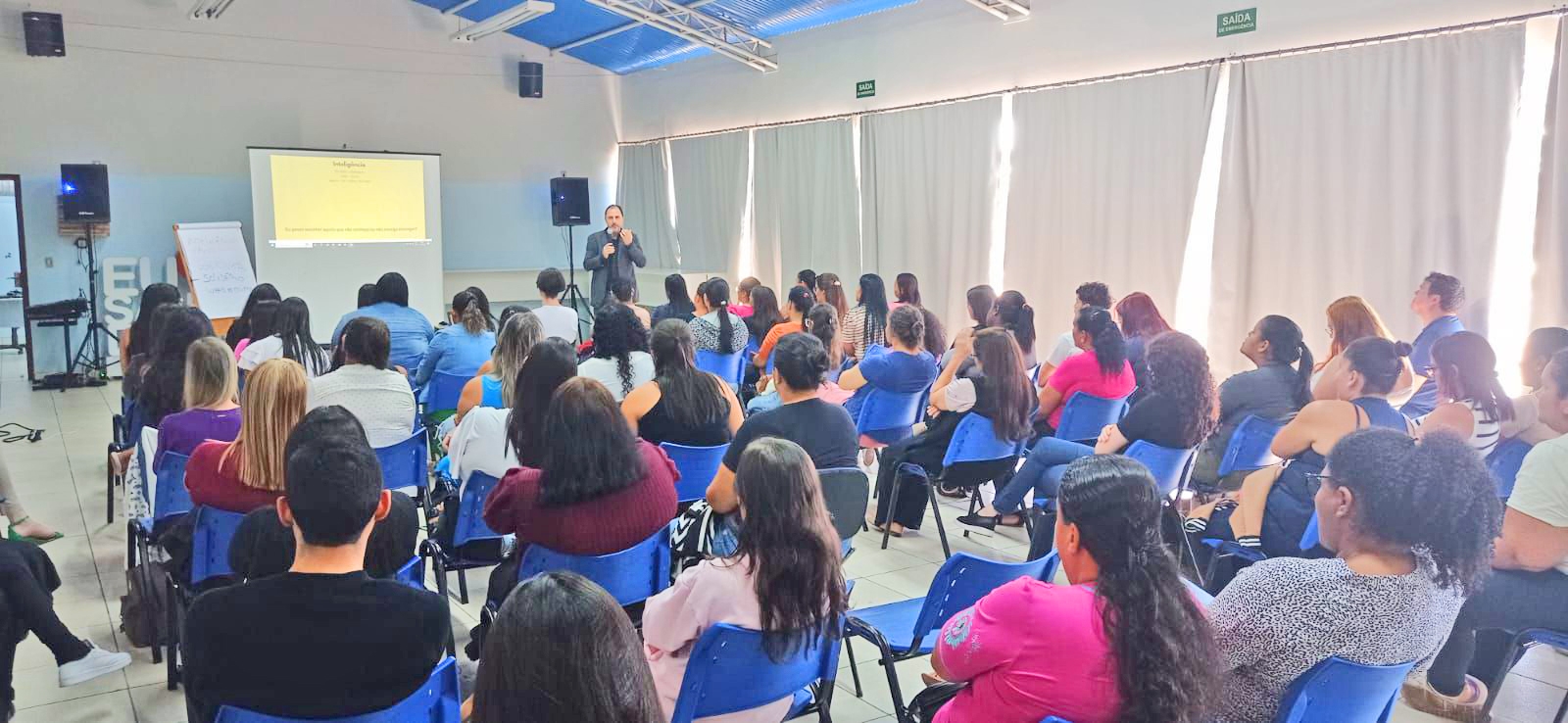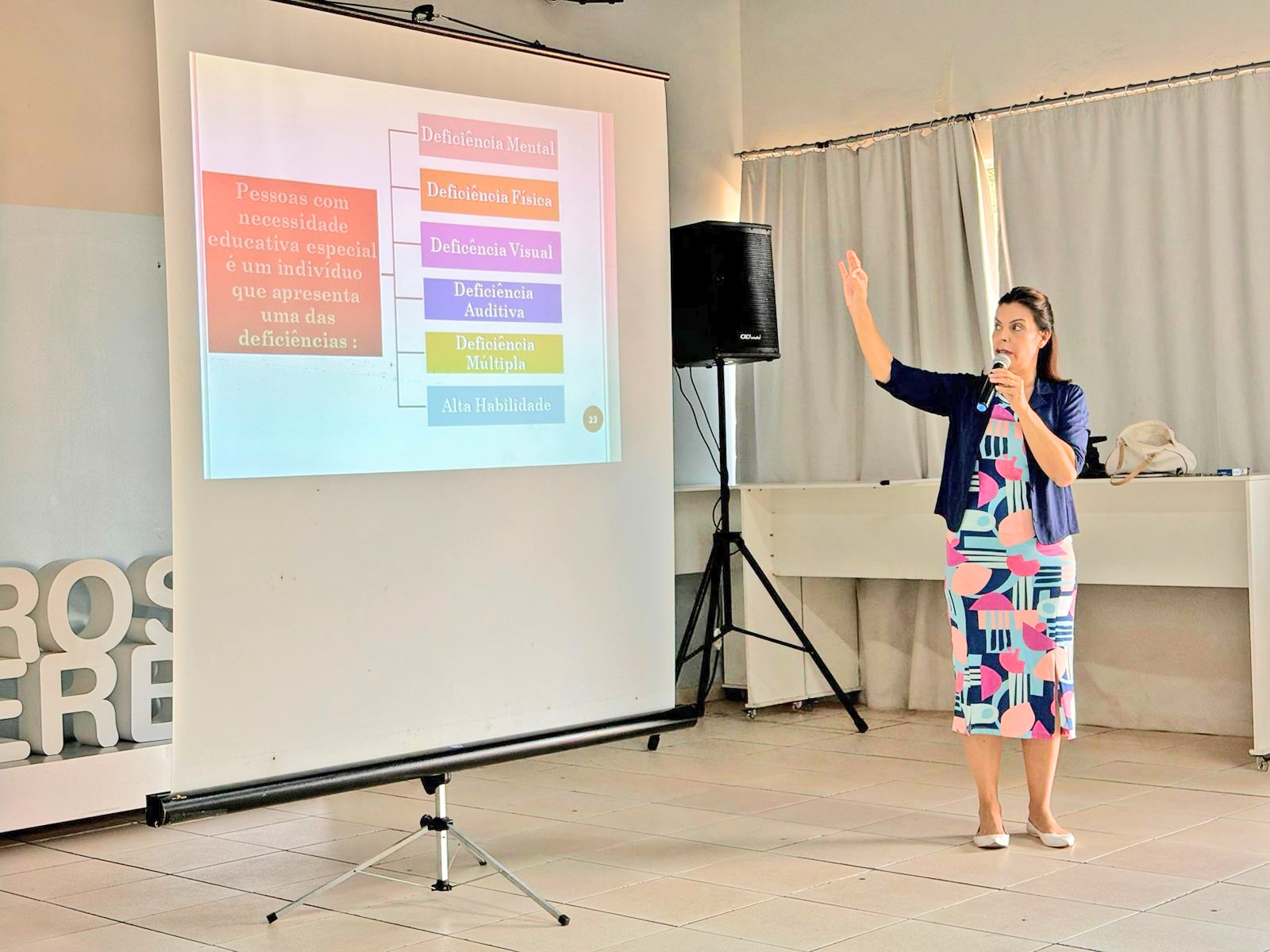 No período da tarde, o Setor de Programas Educacionais, do Departamento Municipal de Educação, realizou uma formação sobre Inclusão voltada somente para os estagiários da Educação Municipal. A formação foi conduzida por Teresa Cristina Citelli, membro da empresa de assessoria Pedagógica que irá desenvolver várias formações continuadas e oficinas para os profissionais da Educação Municipal.
