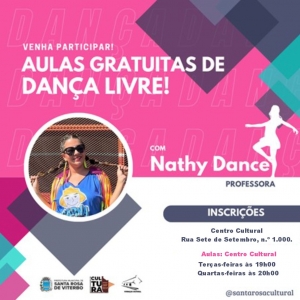 O Departamento de Cultura está com inscrições abertas para aulas GRATUITAS de dança, com a professora Nathy Dance. Seja iniciante ou experiente, você está convidada (o) para explorar o mundo da dança e se divertir, exercitar-se e aprender novos passos.