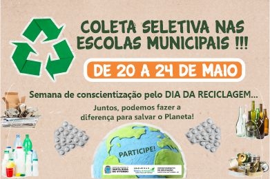 O Departamento de Meio Ambiente da Prefeitura de Santa Rosa de Viterbo convida toda a comunidade escolar e toda a sociedade para participar da Semana de Coleta de Materiais Recicláveis, que acontecerá nas escolas municipais de 20 a 24 de maio. Esta iniciativa pretende conscientizar alunos, pais e professores sobre o Dia da Reciclagem e a importância da coleta seletiva para a preservação do Meio Ambiente.