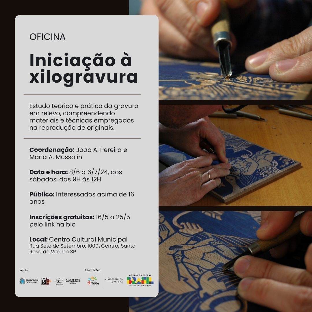 O Departamento de Cultura convida você a participar da Oficina de Iniciação à Xilogravura. Esta é uma oportunidade única para conhecer e explorar a arte da xilogravura, uma técnica de impressão milenar, com orientação dos profissionais João Augusto Pereira e Maria Augusta Mussolin.