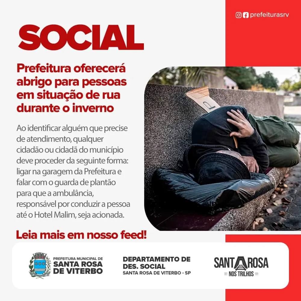 Com a chegada do inverno, o Departamento de Desenvolvimento Social continua prestando atendimento aos moradores de rua e pessoas vulneráveis que necessitam de cuidados e proteção contra o frio. O fluxo de atendimento será organizado da seguinte maneira: se alguém da cidade encontrar um cidadão (a) que necessite de assistência devido às baixas temperaturas, deve ligar para a garagem e falar com o responsável pelo pátio, que acionará a ambulância, a qual levará a pessoa para o Hotel Malim em nossa cidade. No hotel, o atendente providenciará hospedagem e alimentação para o indivíduo atendido. No dia seguinte, a equipe do CREAS irá ao hotel para acompanhar e encaminhar o atendido para o Fundo Social, que fornecerá roupas e agasalhos.