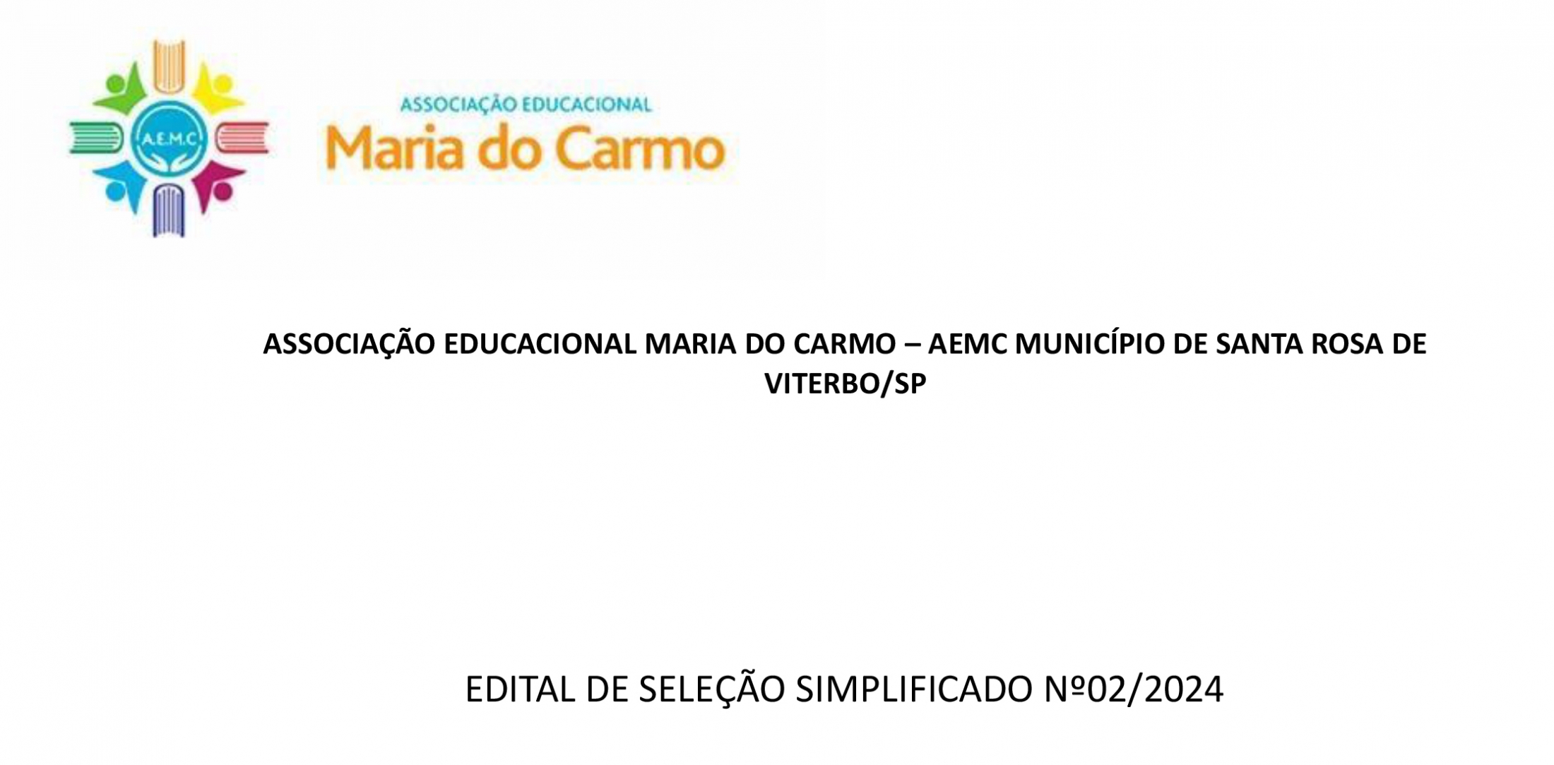A Associação Educacional Maria do Carmo – AEMC, em parceria com a Prefeitura Municipal de Santa Rosa de Viterbo, através de seu Termo de Colaboração com o Departamento Municipal de Assistência Social, abre o presente Edital de Seleção Simplificado para contratação de Visitador Social.