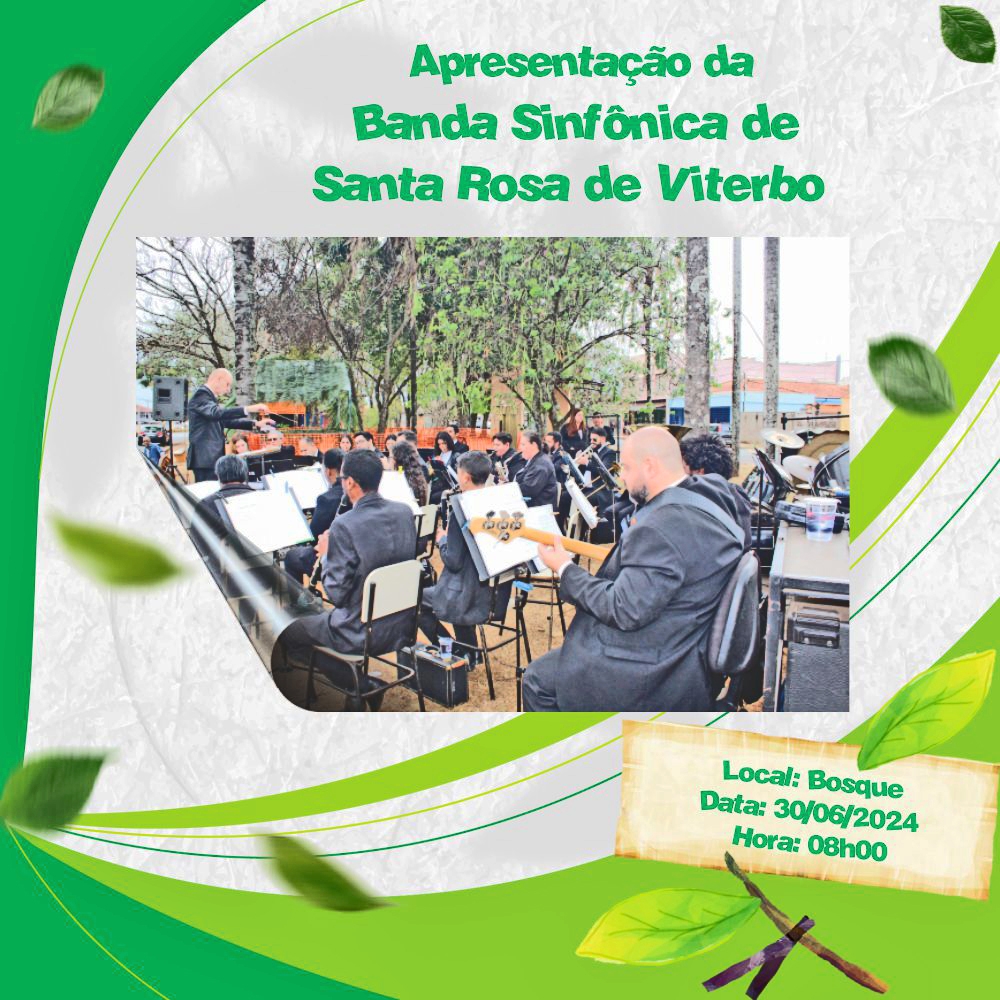 A Banda Sinfônica de Santa Rosa de Viterbo, sob a regência do maestro Maurílio de Oliveira Júnior, se apresentará no Bosque Municipal, apresentando um repertório popular com obras imortais da música popular brasileira, que incluem “Carinhoso” de Pixinguinha, “Aquarela do Brasil” de Ary Barroso, “Tico-tico no Fubá” de Zequinha de Abreu, “Trompete da Espanha” de Gilberto Galiardi, entre outras.