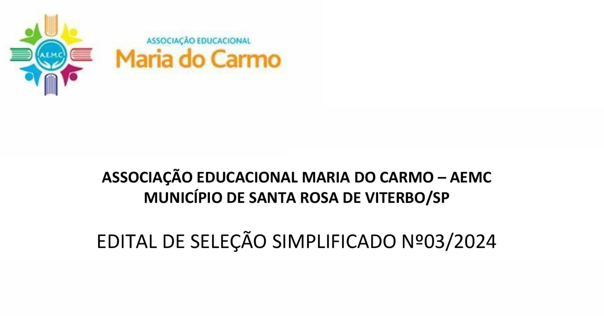 Link para download do edital 03/24: https://santarosa.sp.gov.br/pagina/262_ASSOCIACAO-EDUCACIONAL-MARIA-DO-CARMO-AEMC-MUNICIPIO-DE-SANTA-ROSA-DE-VITERBO.html