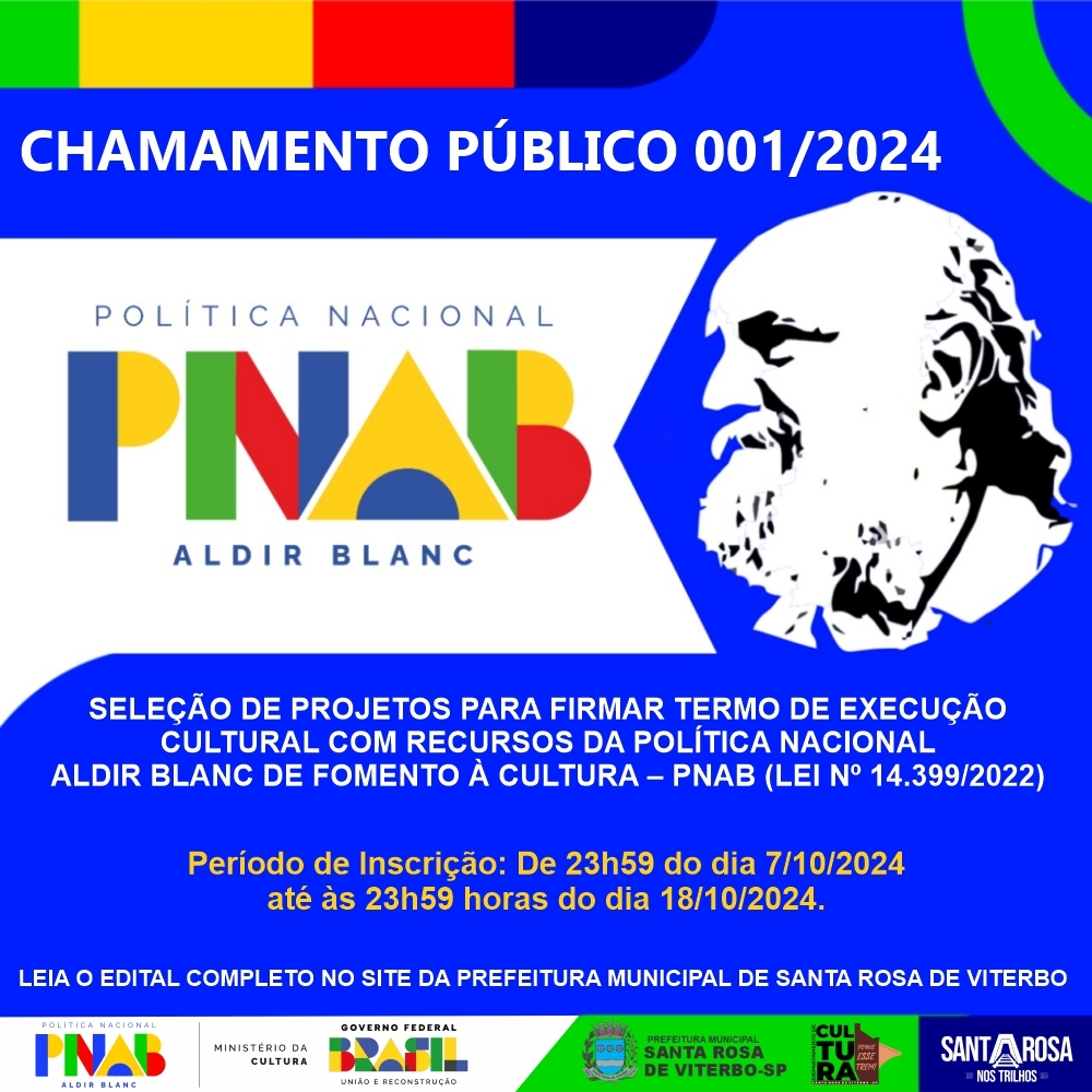 A Prefeitura de Santa Rosa de Viterbo anuncia a abertura do Edital de Chamamento Público Nº 001/2024 para a seleção de projetos culturais, com apoio financeiro proveniente da Política Nacional Aldir Blanc. Serão escolhidos 13 projetos que enriquecem a cultura local, com inscrições abertas de 7 a 18 de outubro de 2024. O cronograma inclui etapas de análise, publicação de resultados e entrega de documentos, com a execução dos projetos prevista até 30 de outubro de 2025. Para inscrever-se, os agentes culturais devem enviar a documentação por e-mail ou entregá-la no Centro Cultural.