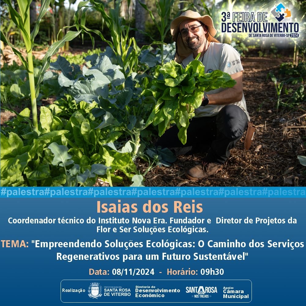 Você está convidado (a) a participar de uma palestra inspiradora com Isaías Reis, especialista em design regenerativo e soluções ecológicas.