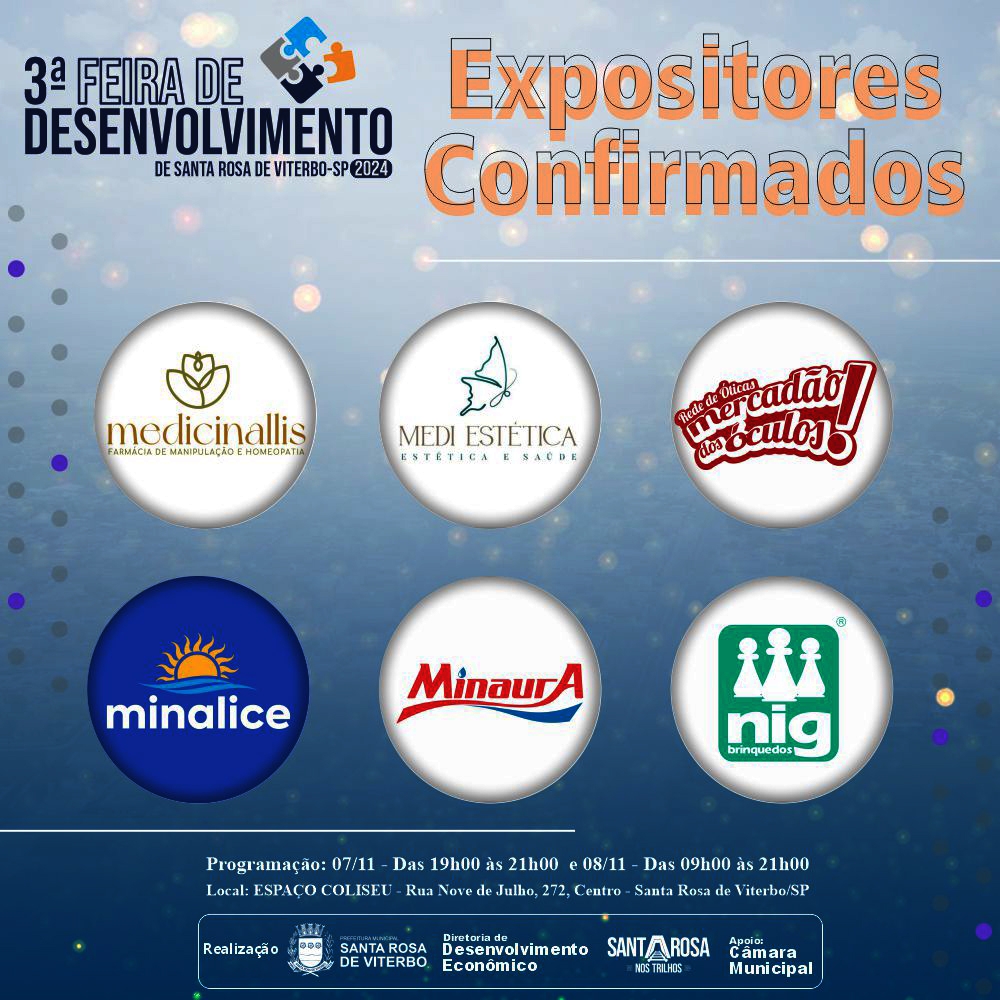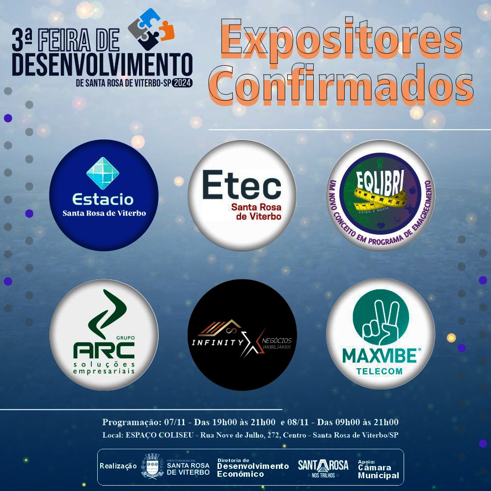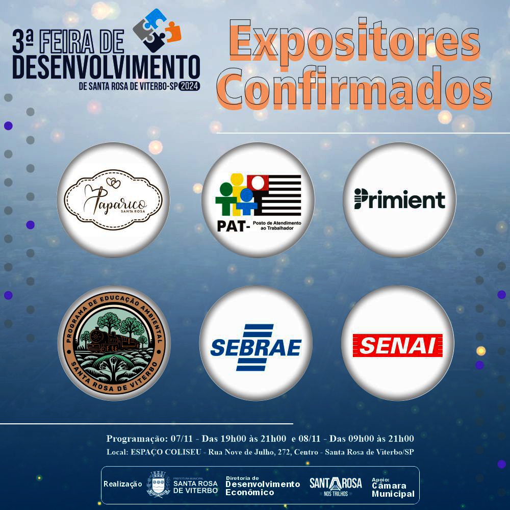 A Diretoria de Desenvolvimento Econômico da Prefeitura de Santa Rosa de Viterbo tem o prazer de anunciar os expositores confirmados para a 3ª Feira de Desenvolvimento Econômico, que acontecerá nos dias 07 e 08 de novembro de 2024.
