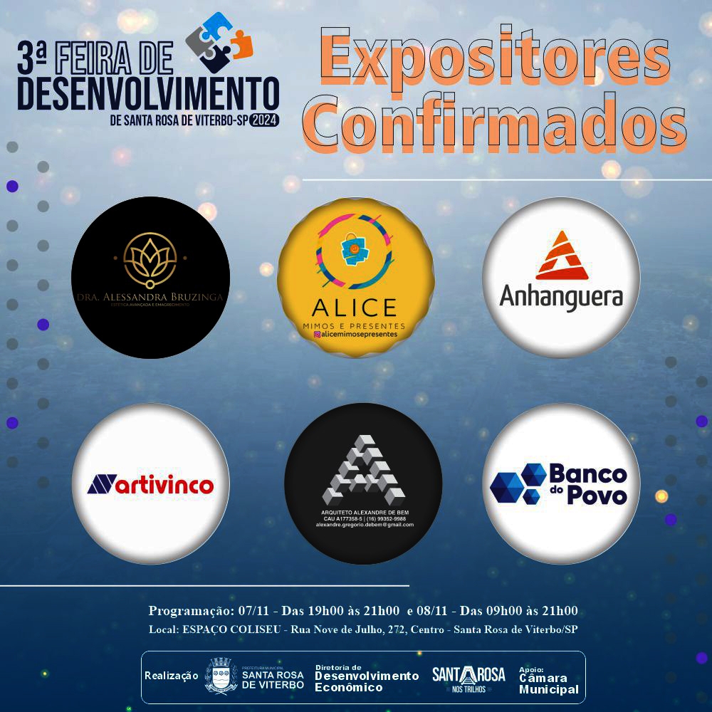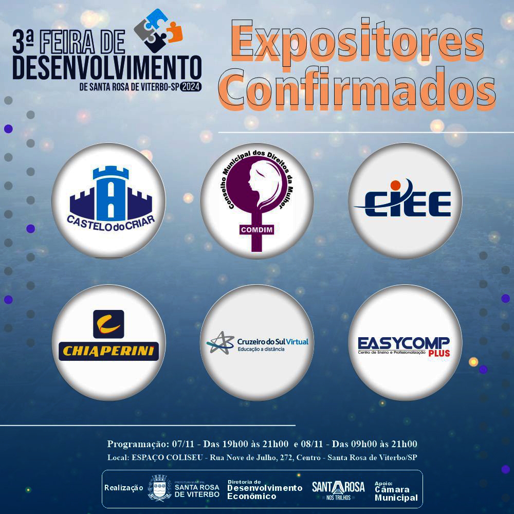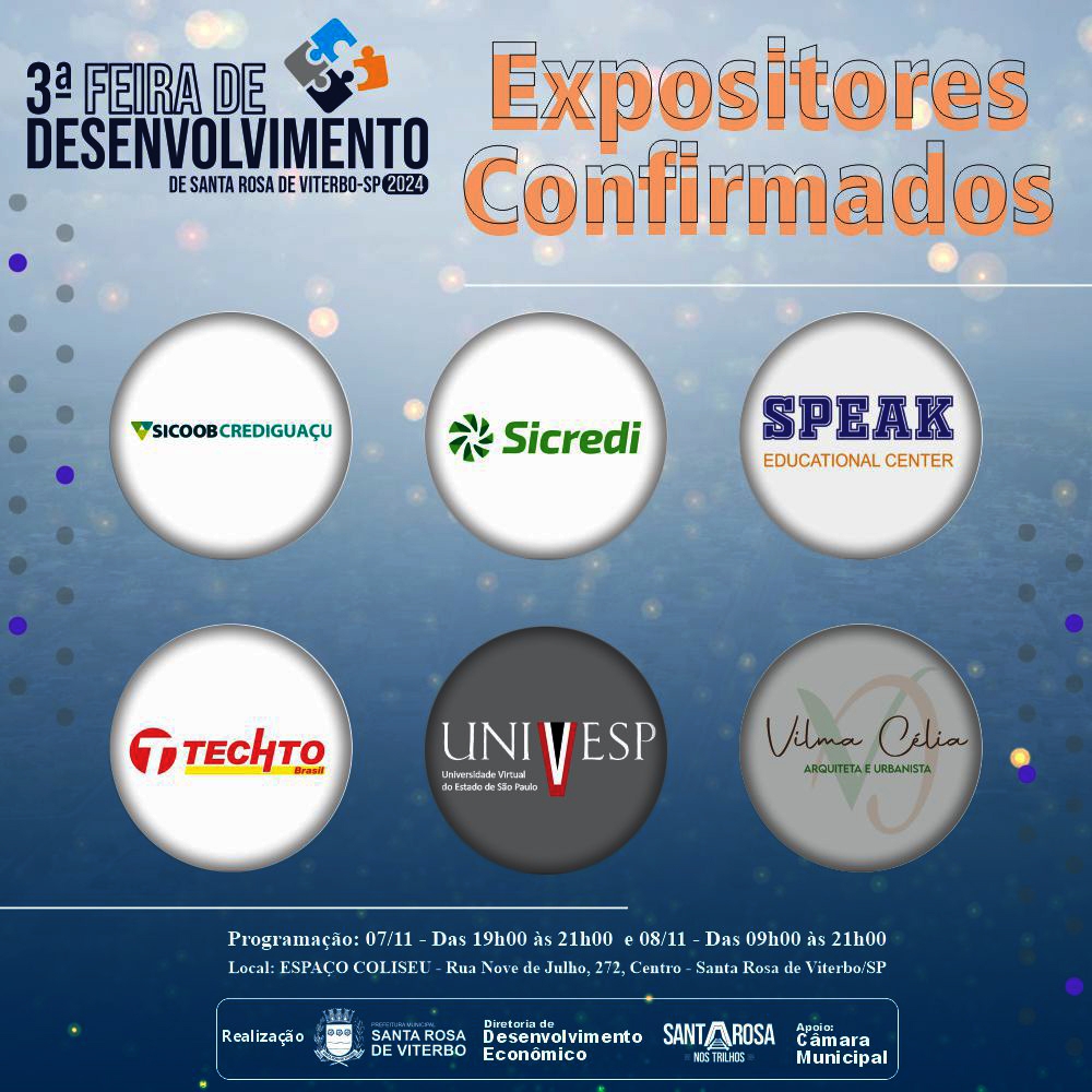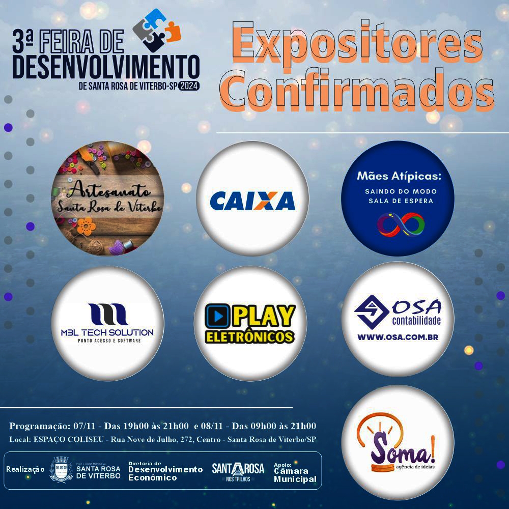 A Diretoria de Desenvolvimento Econômico da Prefeitura de Santa Rosa de Viterbo tem o prazer de anunciar os expositores confirmados para a 3ª Feira de Desenvolvimento Econômico, que acontecerá nos dias 07 e 08 de novembro de 2024.