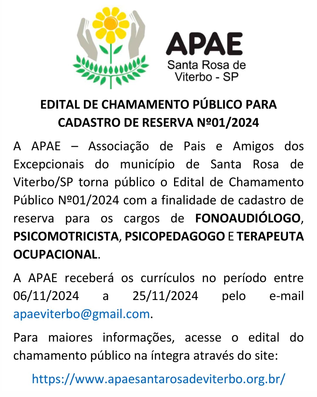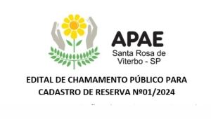 A APAE – Associação de Pais e Amigos dos Excepcionais do município de Santa Rosa de Viterbo–SP torna público Edital de Chamamento Público n.º01/2024 com a finalidade de cadastro de reserva para os cargos de FONOAUDIÓLOGO, PSICOMOTRICISTA, PSICOPEDAGOGO E TERAPEUTA OCUPACIONAL.