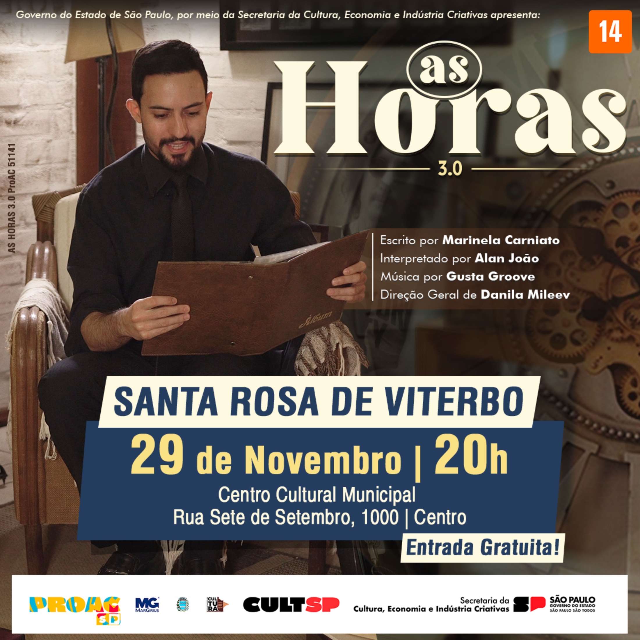 No próximo dia 29 de novembro, sexta-feira, às 20h, será apresentada a peça de teatro “As Horas” no Centro Cultural Municipal da cidade de Santa Rosa de Viterbo com entrada gratuita e público acima de 14 anos.