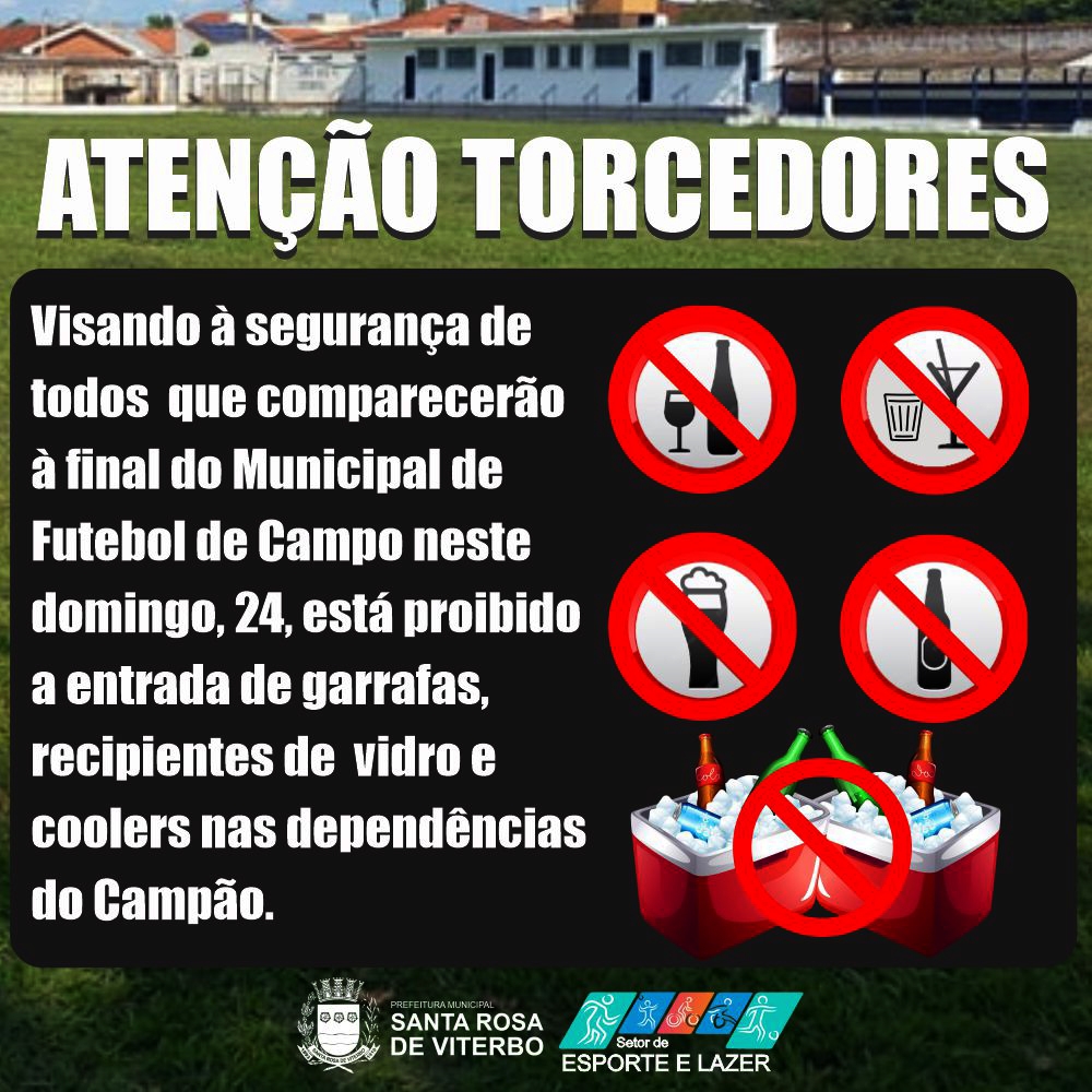 Aos torcedores que comparecerão à final do Municipal de Futebol de Campo neste domingo, 24, entre Atlético Teto e Juventus, no Estádio Rubens Bellize (Campão), informamos que não será permitida a entrada de garrafas ou recipientes de vidro, nem de coolers contendo bebidas alcoólicas nas dependências do campo.