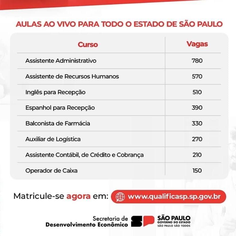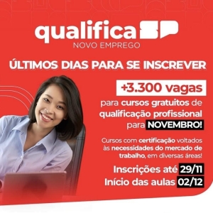 Com 3,3 mil vagas disponíveis, a oferta de cursos gratuitos e remotos de qualificação profissional do Qualifica SP – Novo Emprego, programa da Secretaria de Desenvolvimento Econômico (SDE) do Estado de São Paulo, foi prorrogada até esta sexta-feira (29). Os interessados devem se cadastrar pelo site www.qualificasp.sp.gov.br.