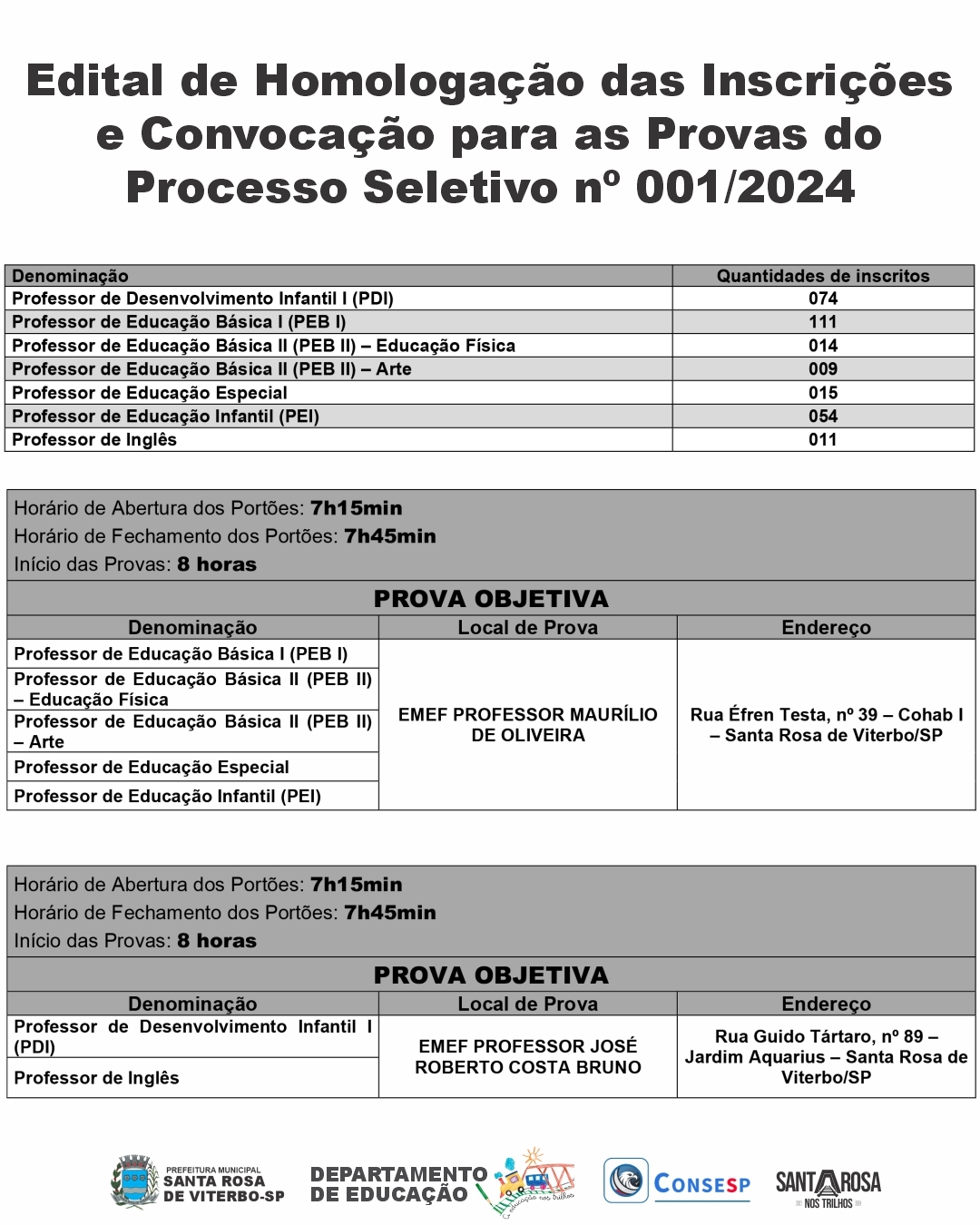 O PREFEITO MUNICIPAL DE SANTA ROSA DE VITERBO, OMAR NAGIB MOUSSA, no uso de suas atribuições legais, torna público, para conhecimento dos interessados, a HOMOLOGAÇÃO DAS INSCRIÇÕES e a CONVOCAÇÃO para as provas do Processo Seletivo, conforme estabelecido no Edital nº 001/2024, de 23 de outubro de 2024.